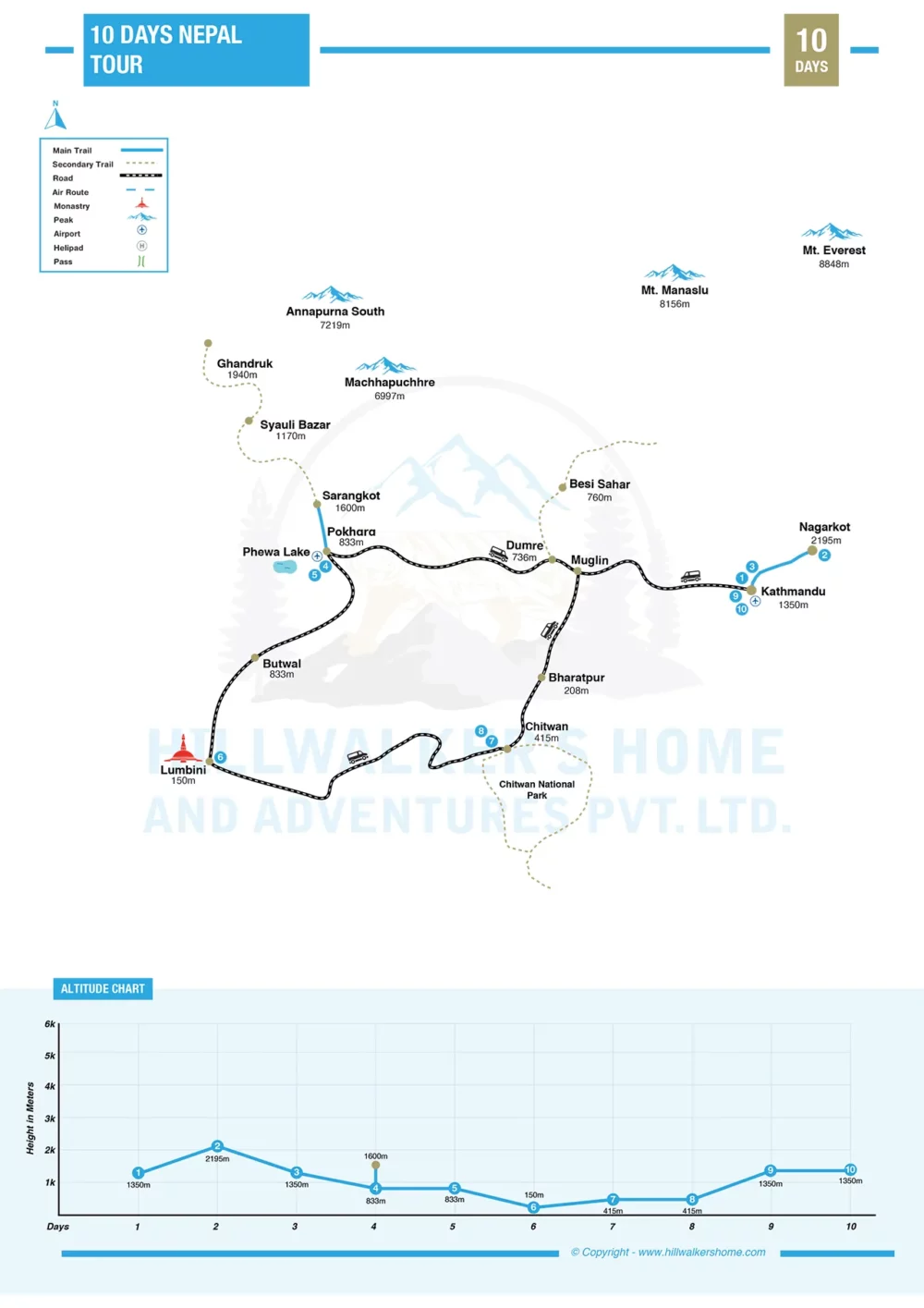 A 10-Day Nepal tour includes visiting and exploring the major tourist attractions of Nepal, such as Kathmandu, Lumbini, Pokhara, Chitwan, and Nagarkot.