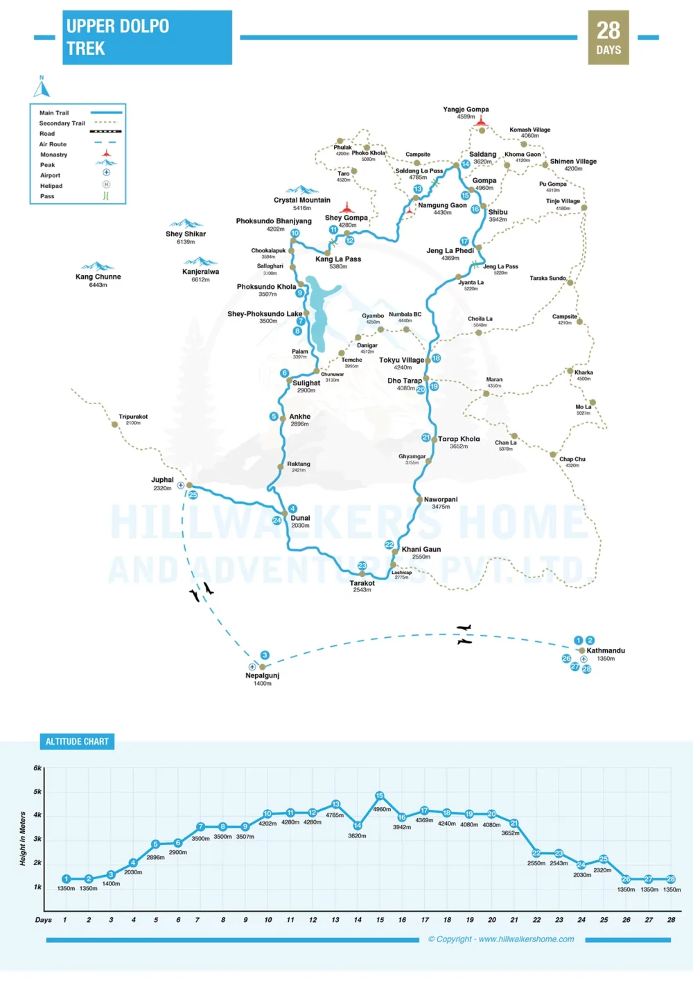 Upper Dolpo trek typically takes 25 to 28 days including your arrival and departure. Nonetheless, Upper Dolpo trek itinerary can be customized based on your preference and physical fitness.